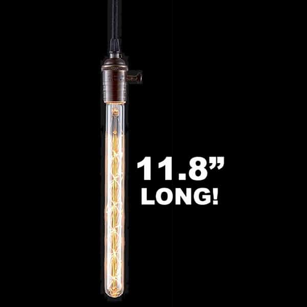 This is an impressive vintage-looking T8 style incandescent bulb, 60W, 1 inch x 11.81 inch, 180 lumens, 3000 hours, 2200k, 120V, E26 base, spiral filament