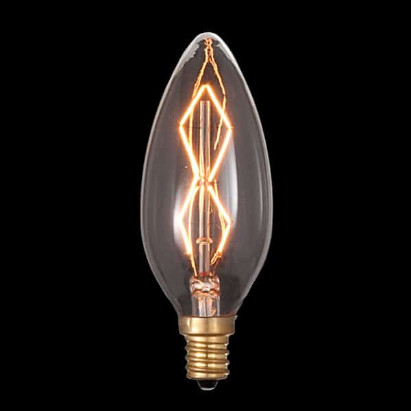 A vintage reproduction bulb, only 25 watts, and in a candelabra base. This one has a torpedo/flame shape, and diamond filaments.Measures 3-3/4″ tall. Great to set the scene in a Victorian or steampunk setting or a laboratory scene. Use it in wall sconces or candelabras. Pair it with one of our FireFly FF-101’s in dimming mode, or our miniFLICKER for a great flickering light! 120VAC.